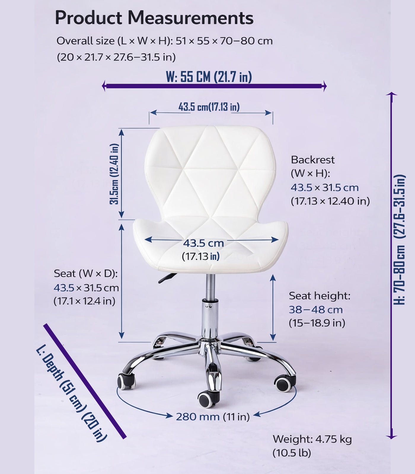 ►Matériaux : Cuir PU - Mousse - Cadre en plastique PP - Base chromée ou nylon - Roulettes en nylon.