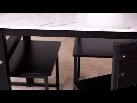 Finish / Color: Marble White tabletop, Black steel legs, Black chairs.