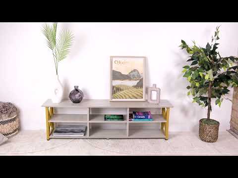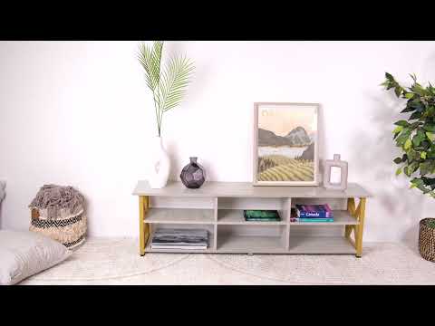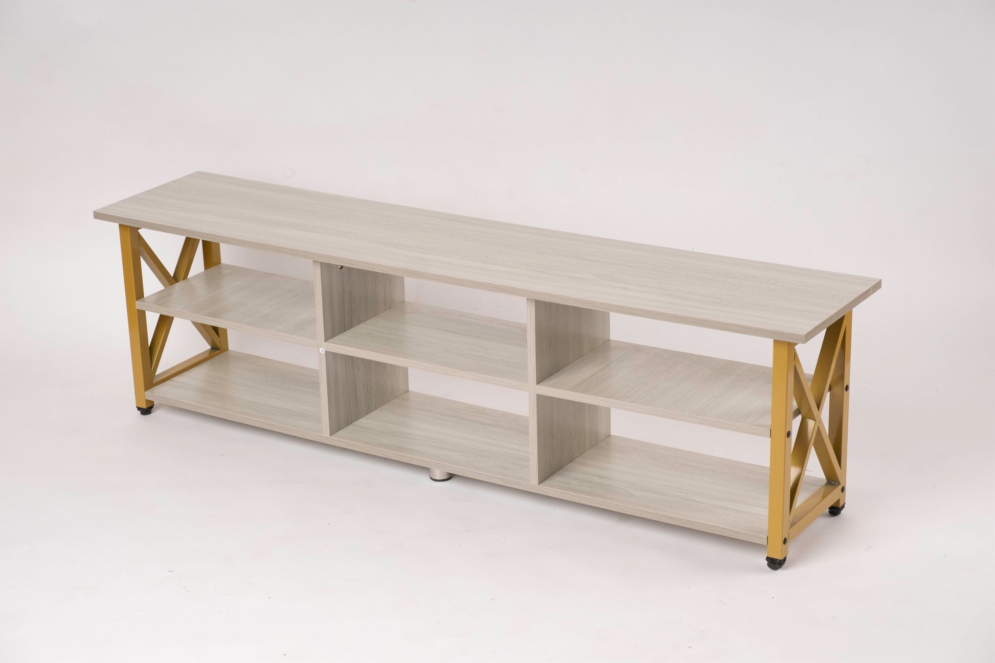 A modern, solid TV console with gold steel legs and six storage compartments for tidy media organization. Made from premium MDF and steel — stylish, stable, and easy to clean.