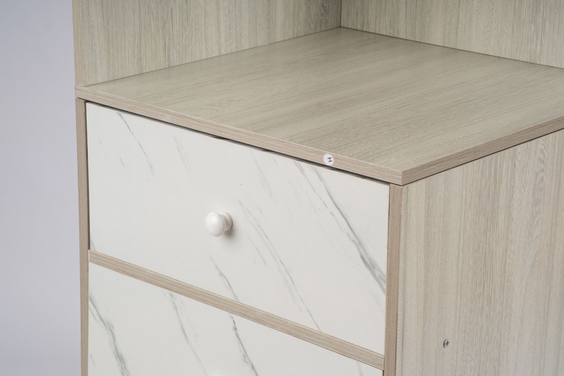 Modern two-tone finish: marble white drawers paired with gray panels bring a clean, contemporary touch to any room.